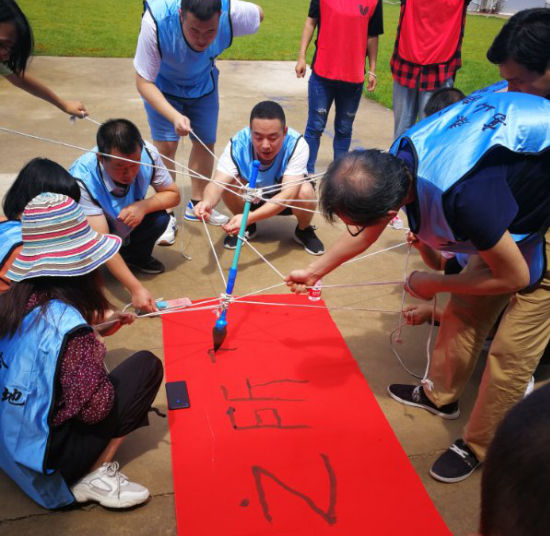 神筆馬良又稱(chēng)妙筆生花,所有隊(duì)員拉繩子的末端,在不接觸毛筆的情況下,按照教練的要求完成指定的詞語(yǔ)。我們紅隊(duì)得到的詞語(yǔ)是“行勝于言”,藍(lán)隊(duì)的詞語(yǔ)是“心之所馳”,在我們兩隊(duì)成員的共同努力下,出色的完成了任務(wù)。