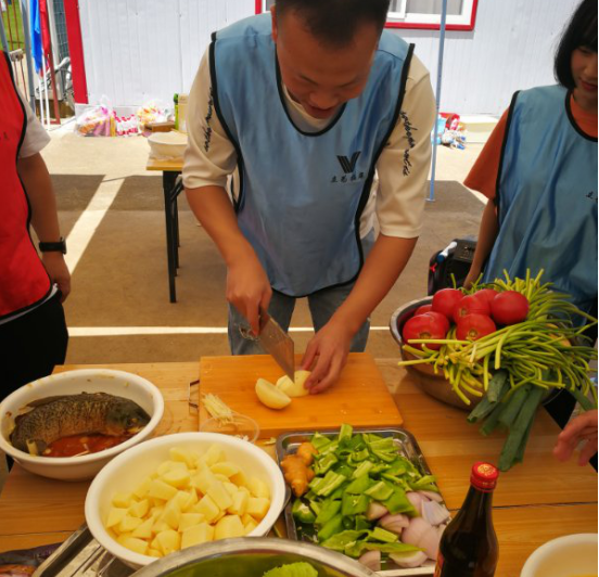 不知不覺(jué),已經(jīng)到了用餐的時(shí)間。秉承“自己動(dòng)手,豐衣足食”的理念,午餐由自己動(dòng)手。大家分工明確,洗菜、切菜、生火、炒菜,有條不紊,在大家的共同努力之下,我們享用了一頓無(wú)比豐盛又美味的午餐,我們的菜品有大盤(pán)雞、酸菜魚(yú)、蒜薹炒肉、蓮菜炒肉、醋溜蓮菜、麻婆豆腐、酸辣土豆絲、西紅柿炒雞蛋。